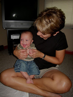 It's hard to believe that on the 25th they'll be 7 months old! Wow, how time flies!! Both boys are so busy playing with their feet these days. I can't keep socks on them anymore! They can both sit up pretty well on their own. In another week or so they should be able to do it without any crash pillows around them. Eli has also discovered some new sounds to make. "Da da da da da da da....." is all we hear now! I get an occasional "MMMMMMMMMMmmm" but nothing that sounds like "Mama." I'm sure it will come soon enough.